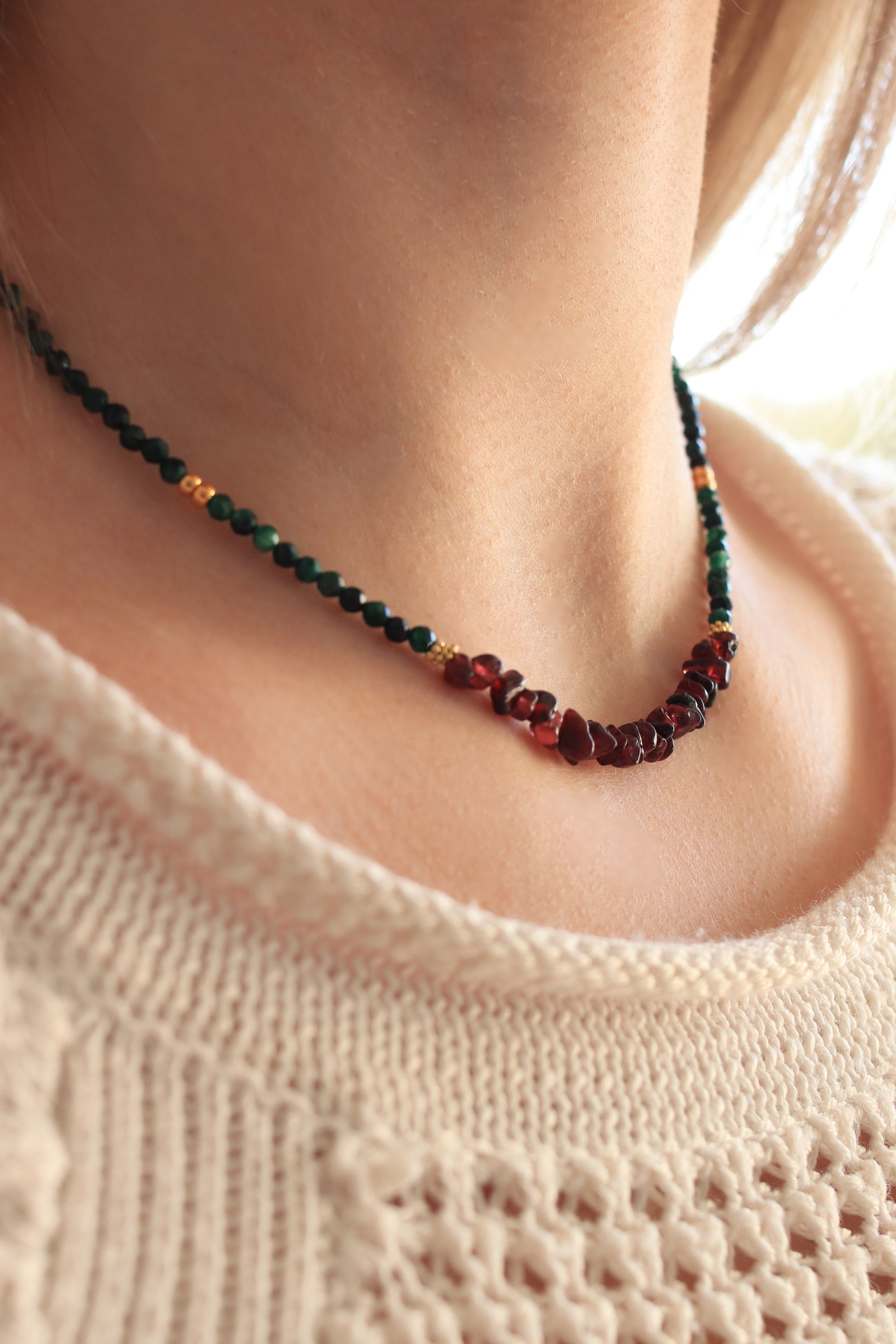 L’alliance du jade et du grenat crée un équilibre harmonieux entre douceur et énergie, faisant de ce collier un accessoire parfait pour le quotidien, les occasions spéciales ou comme cadeau porteur de sens.