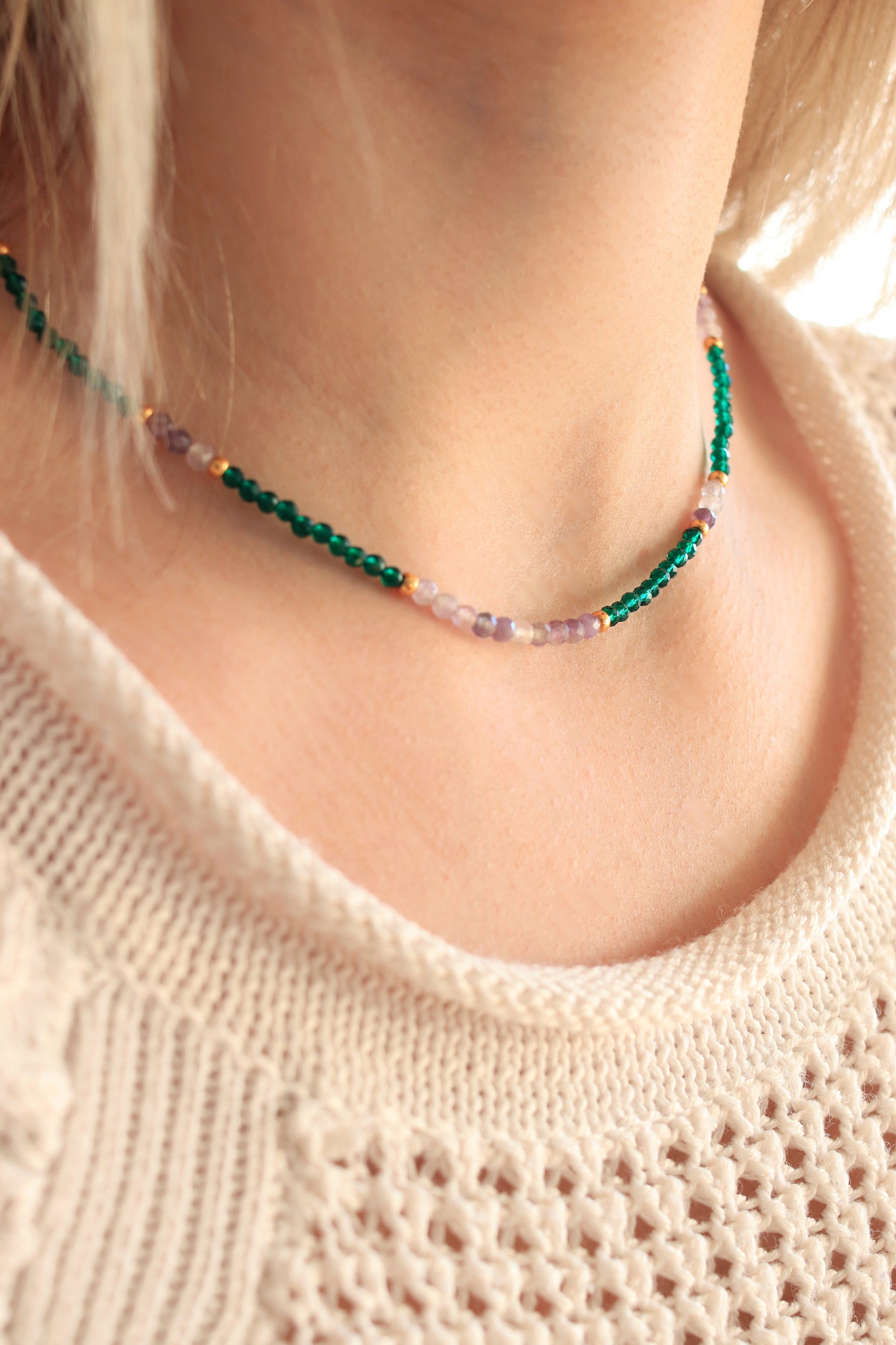 Le collier "Mystique Améthyste" est une ode à la spiritualité, à la sérénité et à l’élégance intemporelle. Conçu en perles d’améthyste, pierre reconnue pour ses vertus apaisantes et protectrices, ce ras-de-cou délicat révèle de magnifiques nuances violettes, profondes et lumineuses.